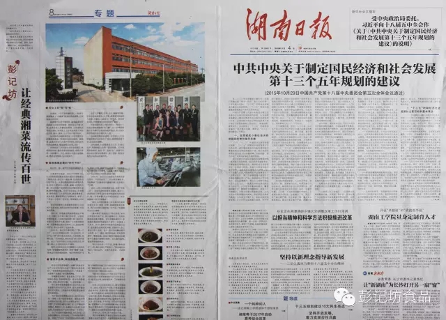 湖南日?qǐng)?bào)對(duì)彭記坊食品專(zhuān)題報(bào)道——《彭記坊讓經(jīng)典湘菜流傳百世》