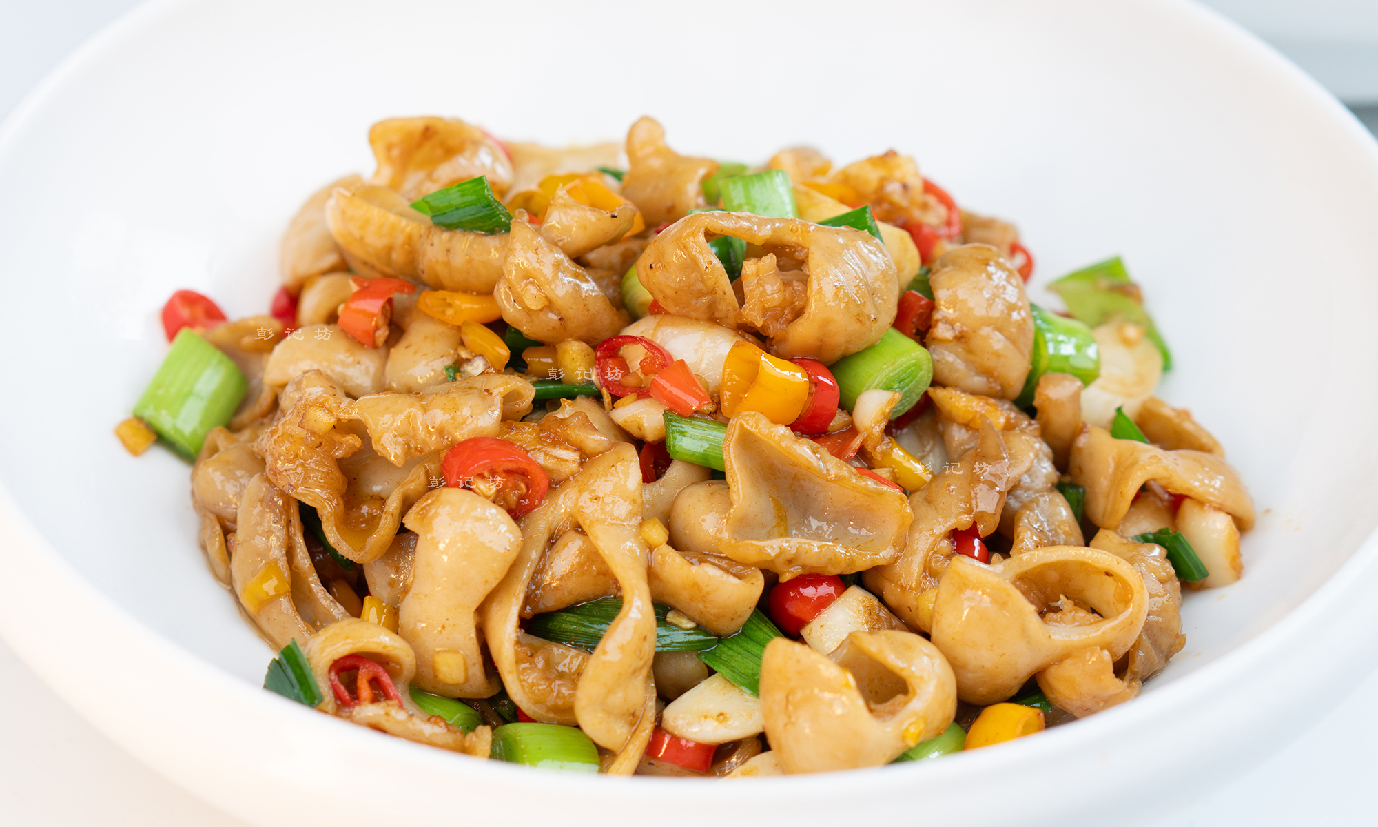 3、炒鍋燒油至180℃,牛蛙去水加適量生粉倒入油鍋炸熟撈出;肥腸加料酒輕過(guò)水撈出。